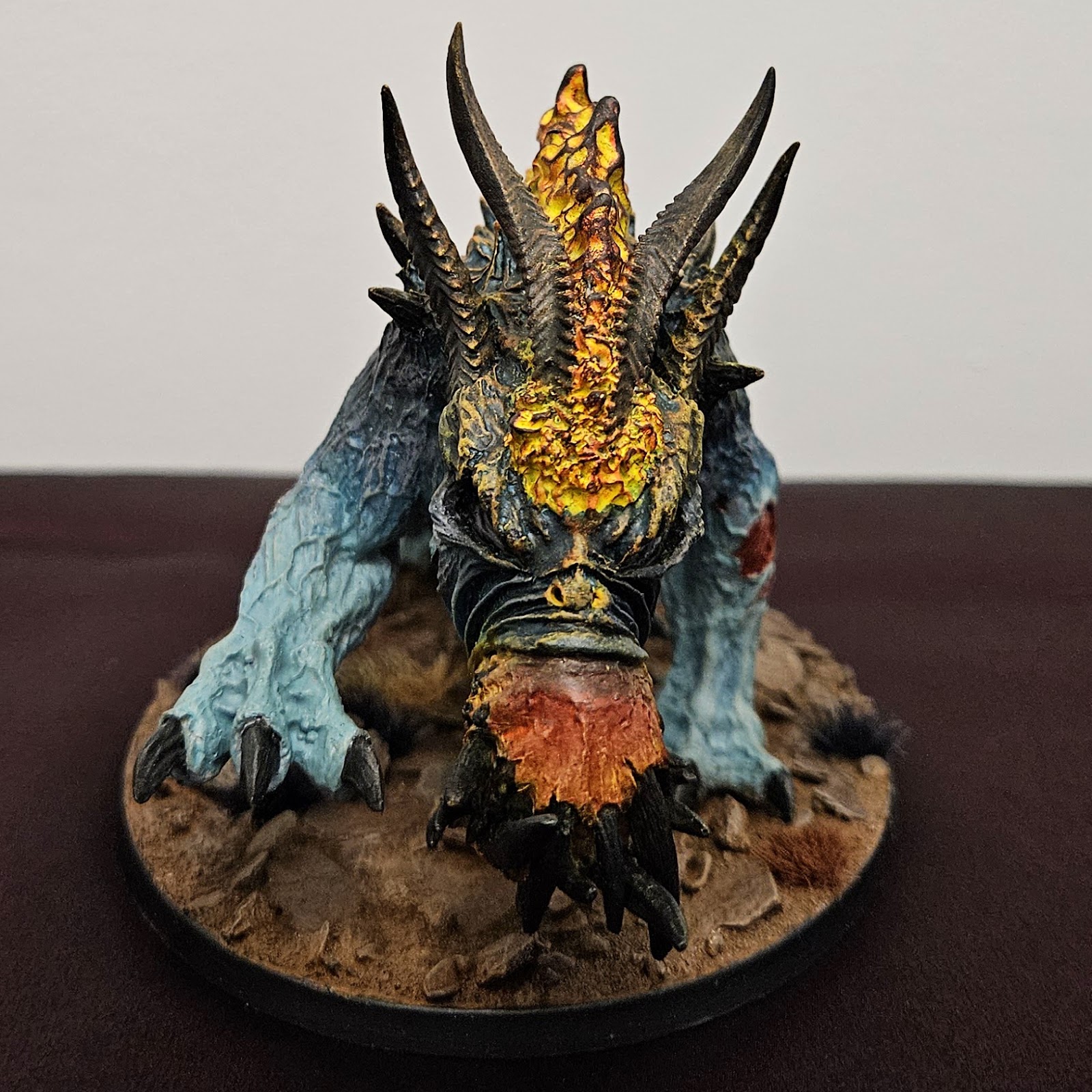 This absolute unit of a miniature was originally a greater spined chaos beast (again retired from the Forgeworld line...). I made several modifications to the base model to bring it in line with the army themes. Firstly, I sculpted a flaming mane running all the way down the miniature starting at the head. It's much less subtle than the hounds, but I think it was needed for the Behemoth as it needed to make a statement - and oh boy does he make a statement!