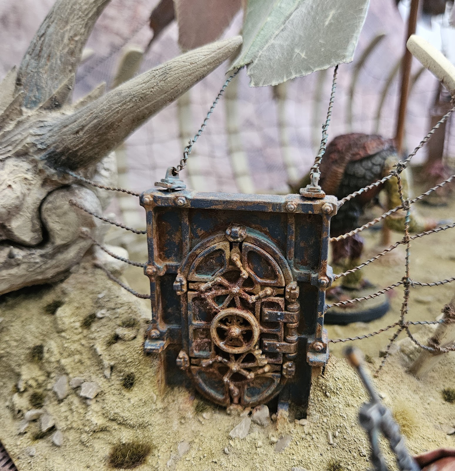 | The doors on the front of the cage were made from styrene sheet and some feet from the 40k pipe terrain set. I built the tiny working hinges from styrene and paperclips (the steel from paperclips is great for this as it doesn't bend easily) |